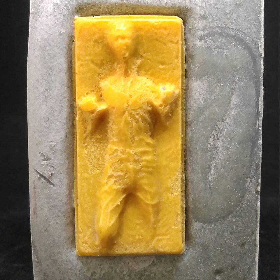 Now you can wash up with a certain space pirate in suspended animation. This coconut-free soap is scented with Frosty Windowpane, a frosty, crispy, cool moistened ozone enhanced with notes of citron, black currant, subtle green florals, eucalyptus, peppermint, cedar, vanilla, and blue spruce.