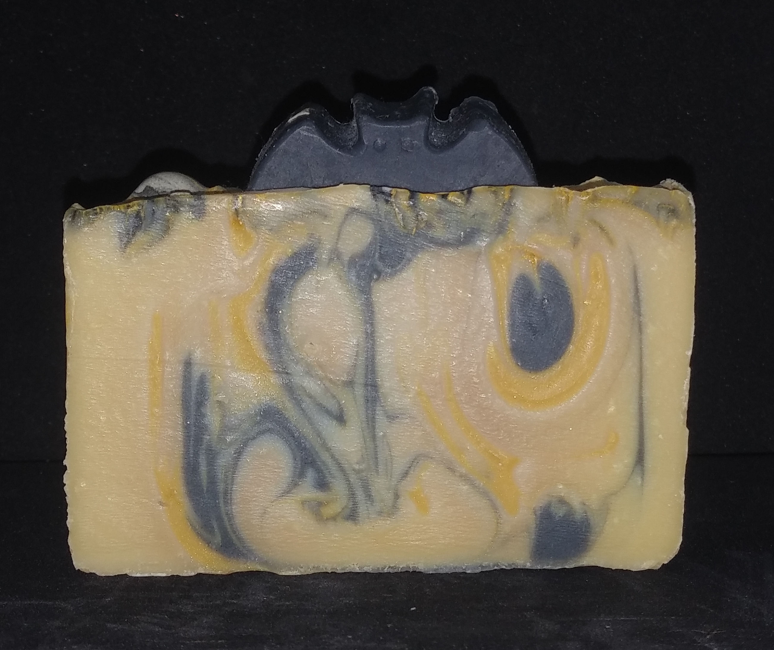 Your progenitor may be the most evil being in the world, and you may have a hard time getting along even with your friends, but that's no excuse to neglect your ablutions. Cleanse away the odors of the hunt with this coconut free soap, swirled in creamy white, black, and gold, topped with charming bat embeds, and scented with a daring and seductive blend of berries, tempting blooms, sensual incense and night musk. Just the thing after hunting the creatures of the night!