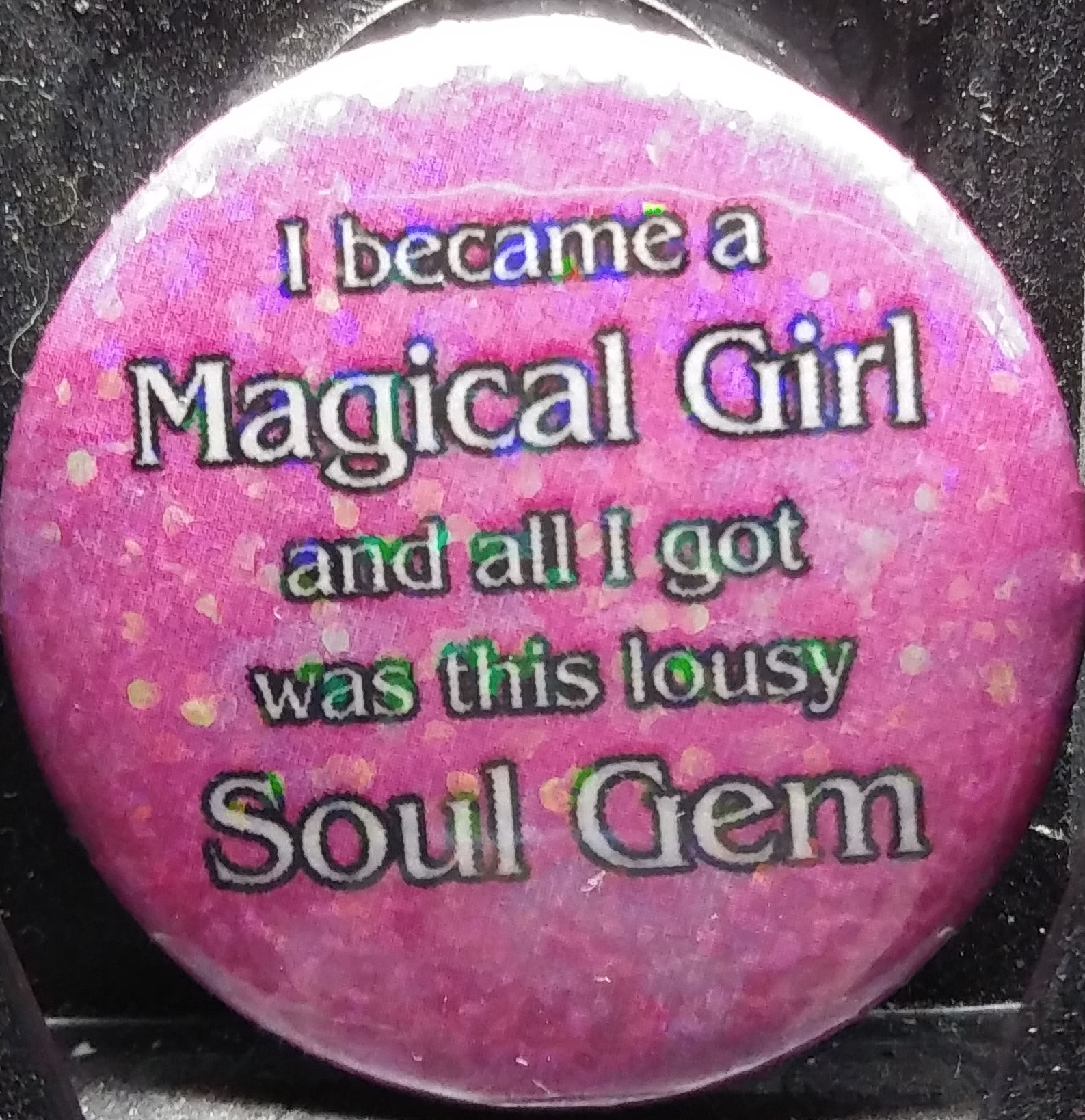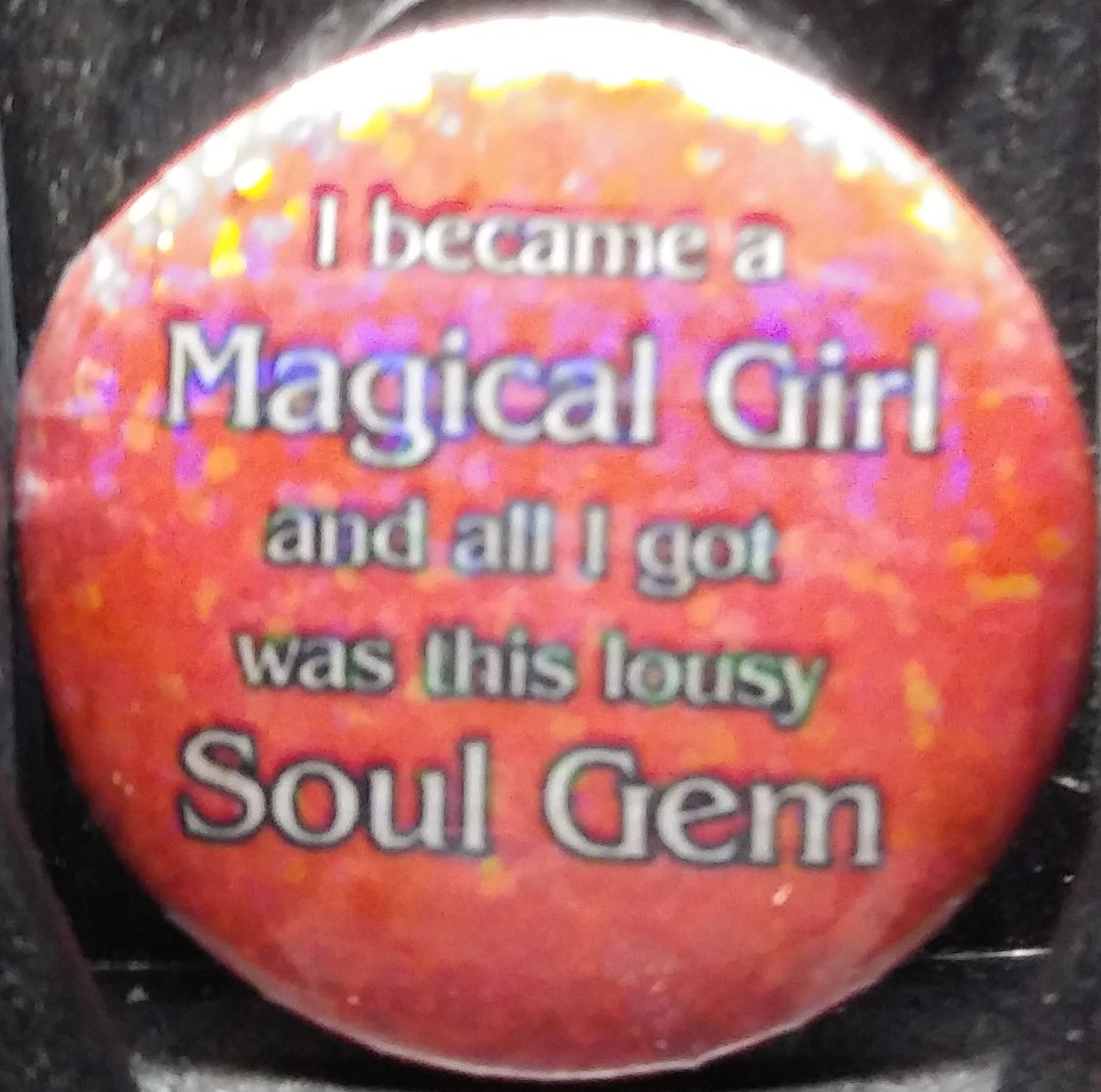 Each "I became a Magical Girl and all I got was this lousy Soul Gem" button is the color of one of the Soul Gems of the five main Magical Girls in the anime - pink for Madoka Kaname, blue for Sayaka Miki, purple for Homura Akemi, yellow for Mami Tomoe, and red for Kyoko Sakura, and covered with a holographic laminate for a "glitter" effect.