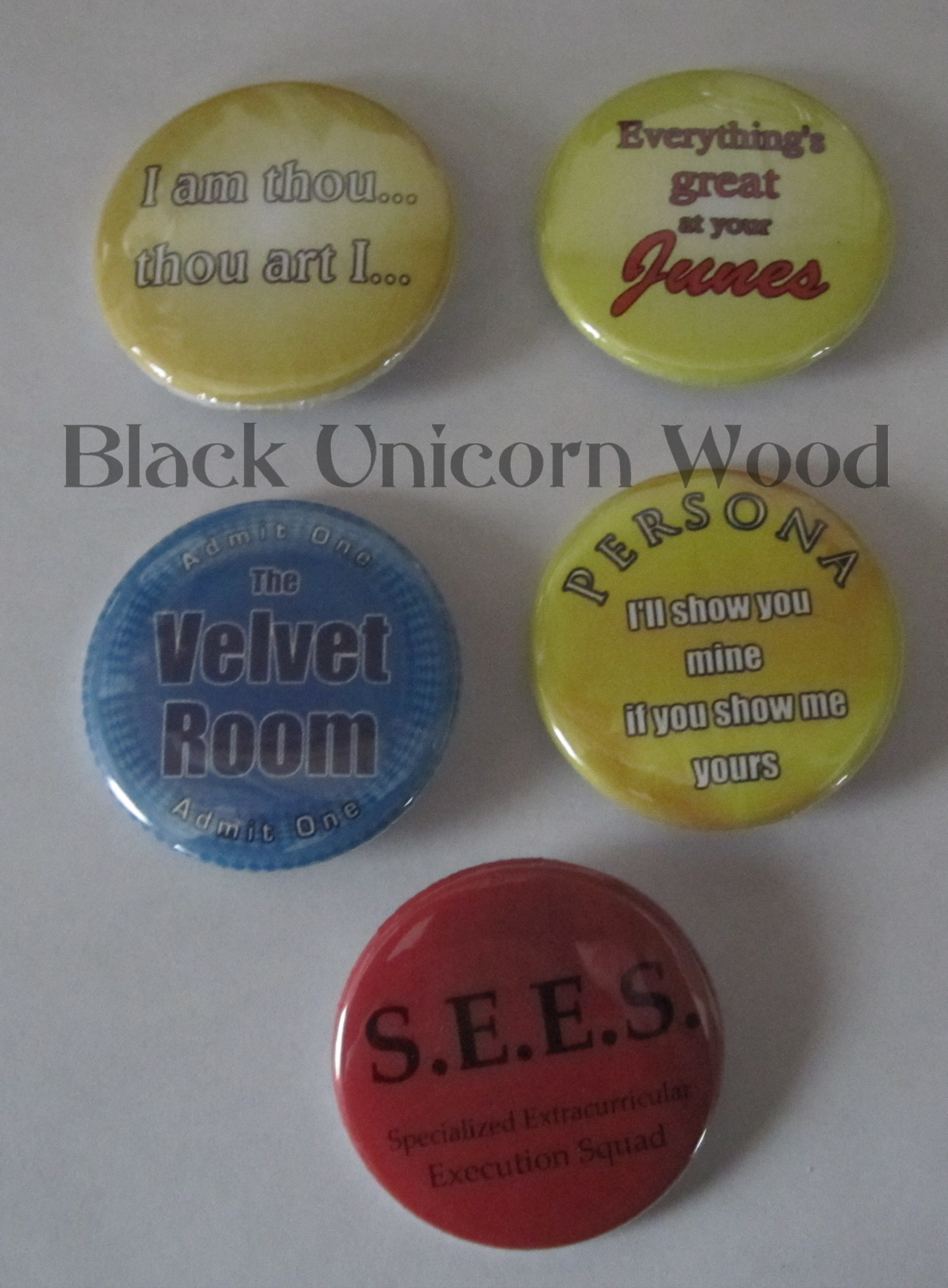 A set of 1.5-inch diameter buttons inspired by Atlus's Persona 3, Persona 4, and Persona 5 videogames. Buttons are also available individually, in packs of three, or as a magnet or keychain. If choosing one of these options, at checkout, in the dialog box that says, "Leave a note for Black Unicorn Wood," please indicate which design you want.
