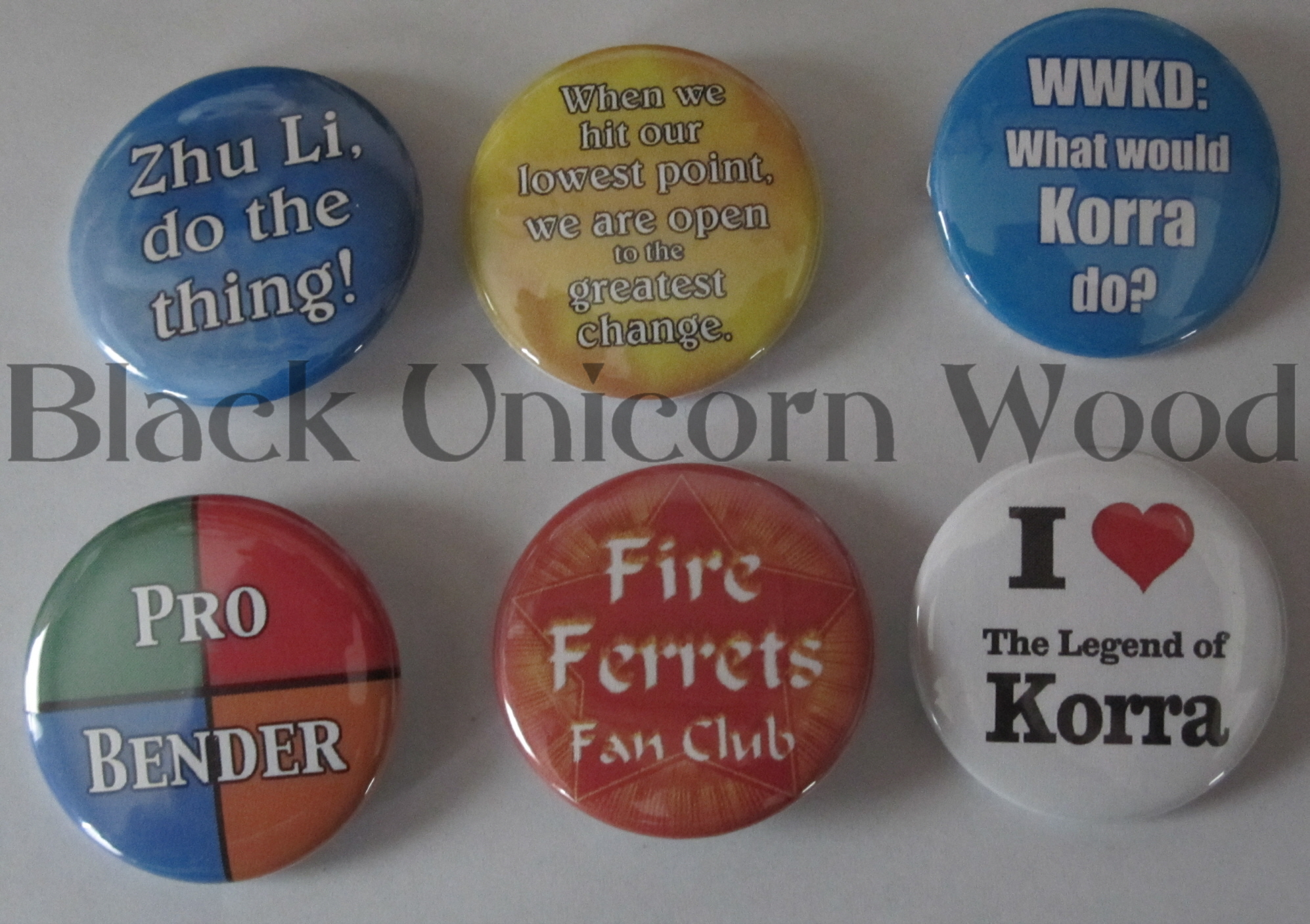 This is a set of six 1 1/2" diameter buttons inspired by Nickelodeon's TV series, "The Legend of Korra." Buttons are available individually, in groups of three, or as a set of six. Any design is also available as a magnet or keychain. If choosing the single button, magnet, or keychain option, at checkout, in the dialogue box that says, "Add a note for Black Unicorn Wood," please specify which design/s you would like.