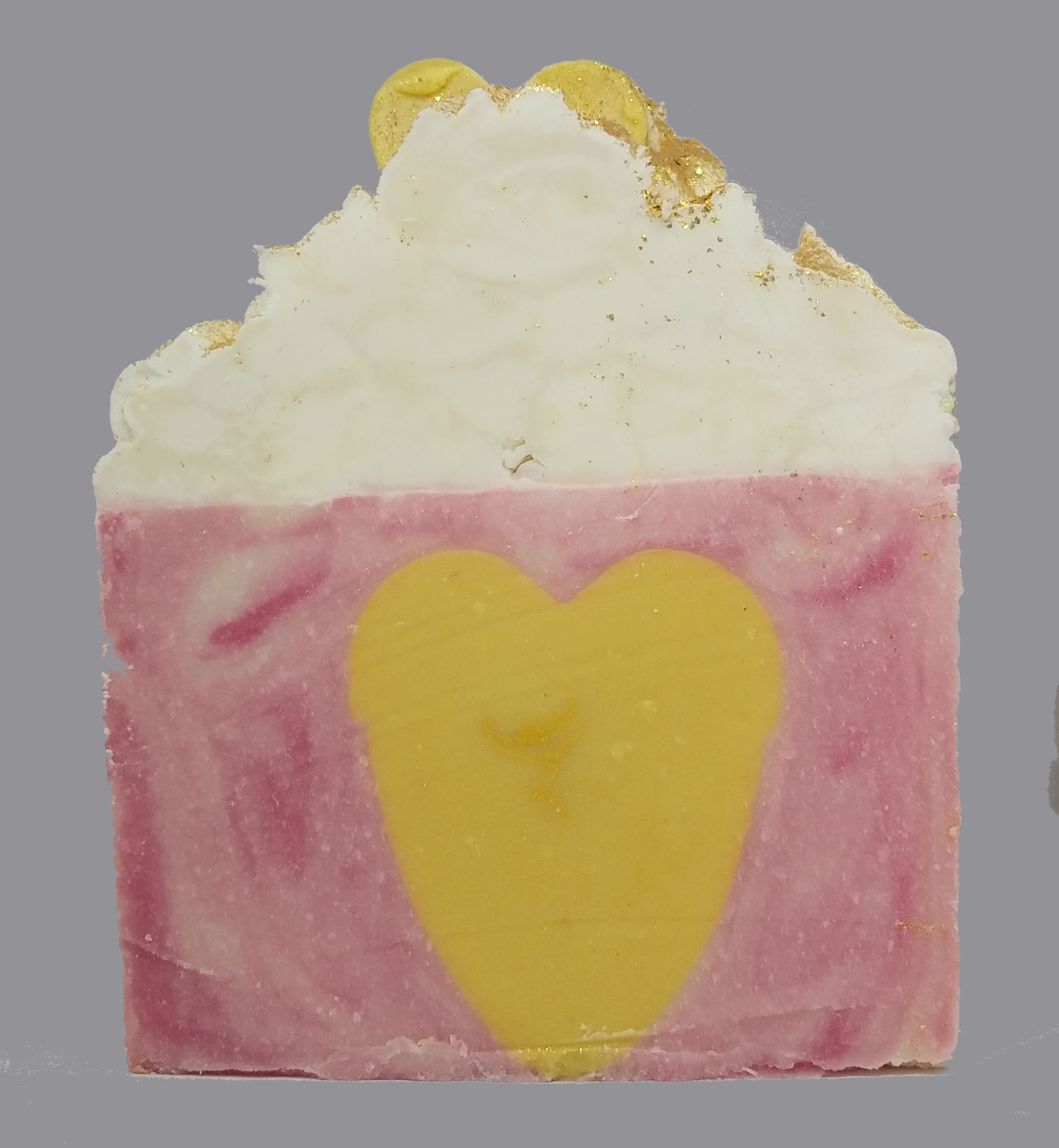 Unleash your inner Magical Girl with this soft pink soap scented with roses, accented with hints of green and powder. Each bar is decorated with pure white soap frosting, gold heart embeds in the center and on top, and a sprinkling of gold mica to complete the theme. In the name of this soap, you will be clean!