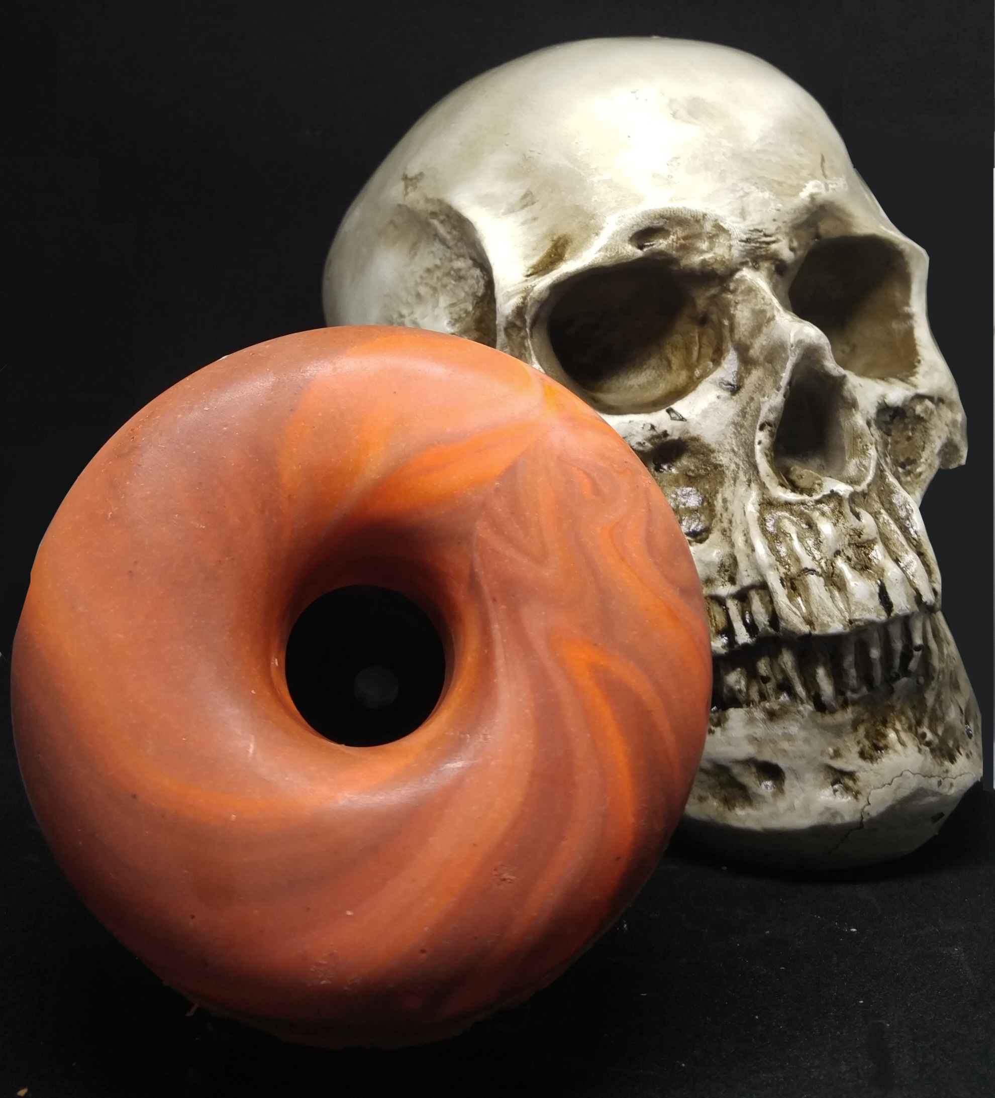 This donut-shaped soap is swirled with orange and brown, and scented with a delightful fragrance that smells like it's right out of the oven, with notes of pumpkin, cinnamon and nutmeg. It's just the thing to make you think of cozy autumn days all year round!