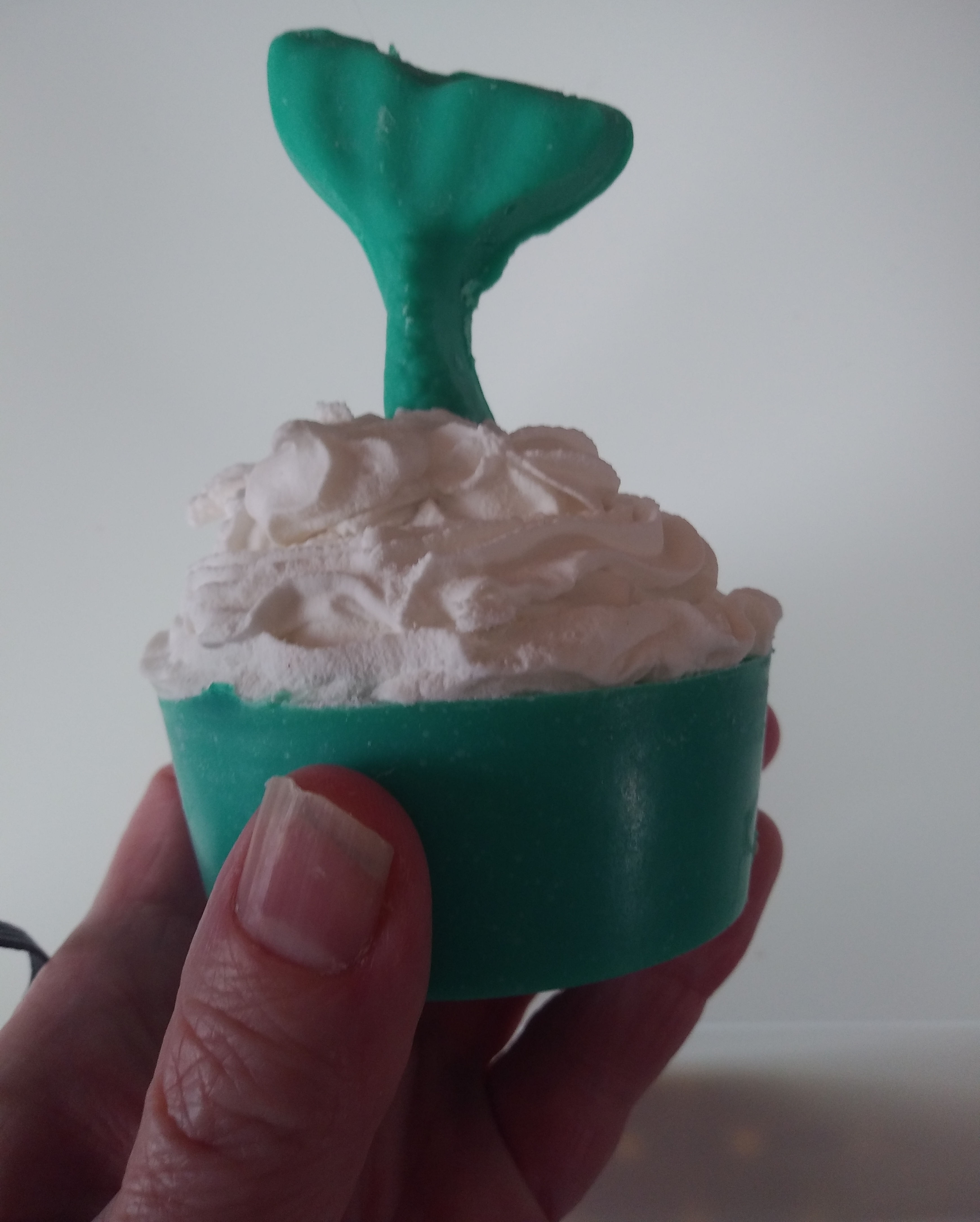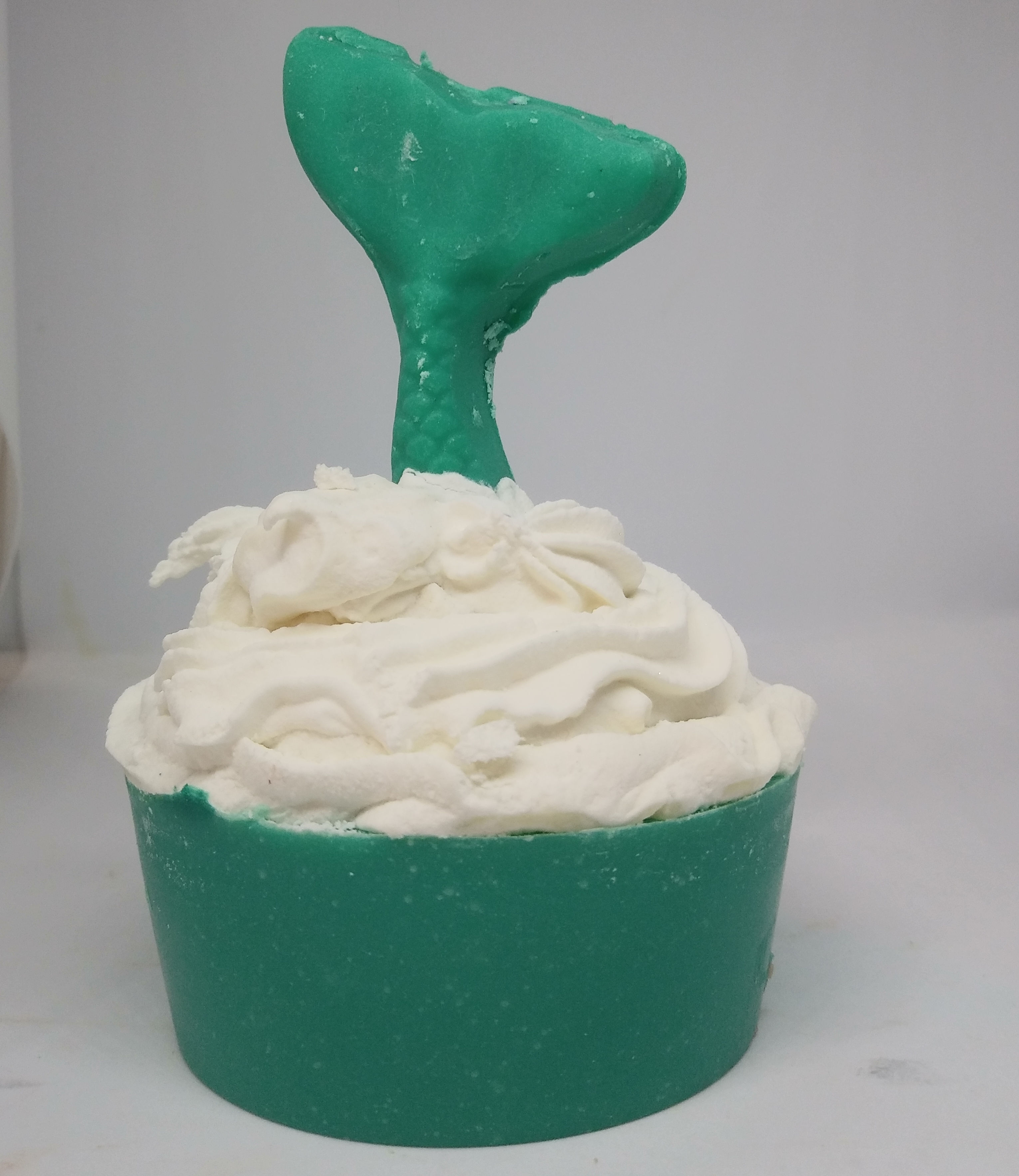 These green soap cupcakes are topped with soap frosting and mermaid tail embeds. They are scented with a fresh watery green fragrance that delicately combines notes of ocean mist and sea grass with agave nectar and coconut milk.