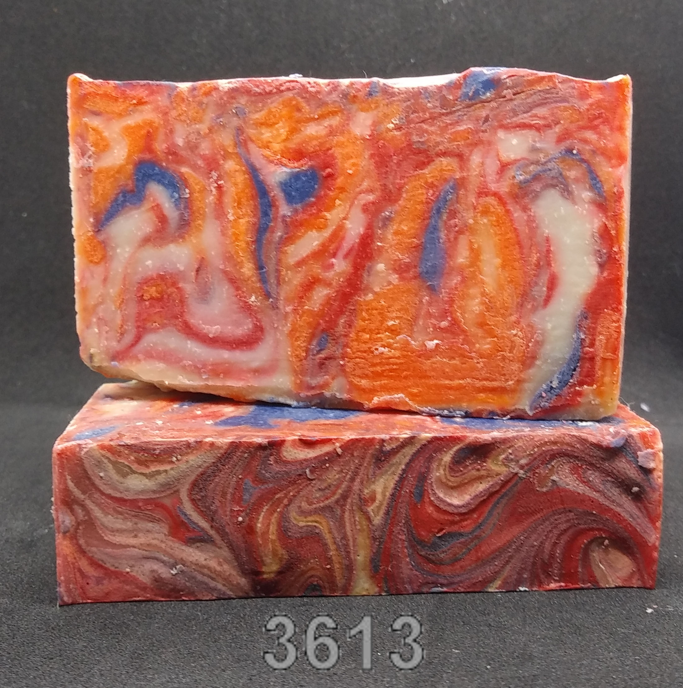 Are you feeling the need to integrate two opposing sides of yourself? Do you seek to define yourself on your own terms? Wash up with this soap swirled in white, red, orange, and blue, and scented with a blend of fragrances combining notes of coriander, snow flurries, frosted mint leaf, Arabian lavender, Baltic amber, cedar wood, cypress, and smoky vetiver with a fragrant blend of warm spices, cinnamon, clove and nutmeg. Merge those two halves into one powerful whole, and let evil beware!